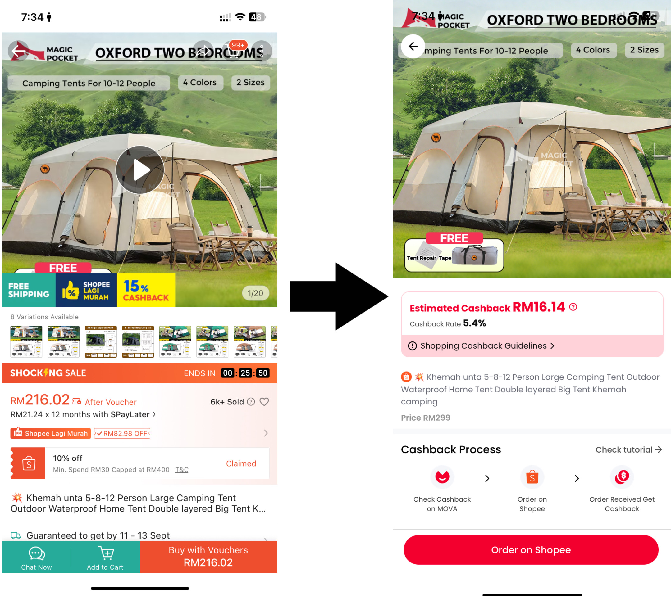 Bahagian paling menyeronokkan dalam MOVA ialah membeli-belah seperti biasa tetapi setiap kali, duit anda "beranak". Proses membeli amat mudah: buka aplikasi, pilih kedai atau produk yang anda mahu, buat pesanan, dan bayar seperti biasa. Bezanya, selepas pembayaran selesai, anda akan nampak jumlah cashback dikira secara automatik.