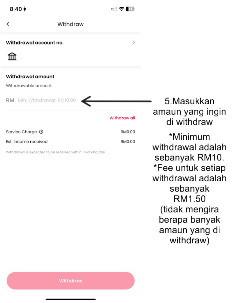 Berikut adalah cara membuat withdrawal masuk ke akaun bank atau e-wallet: